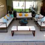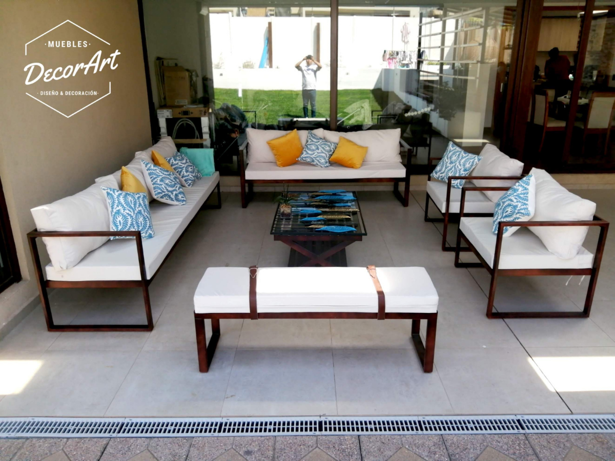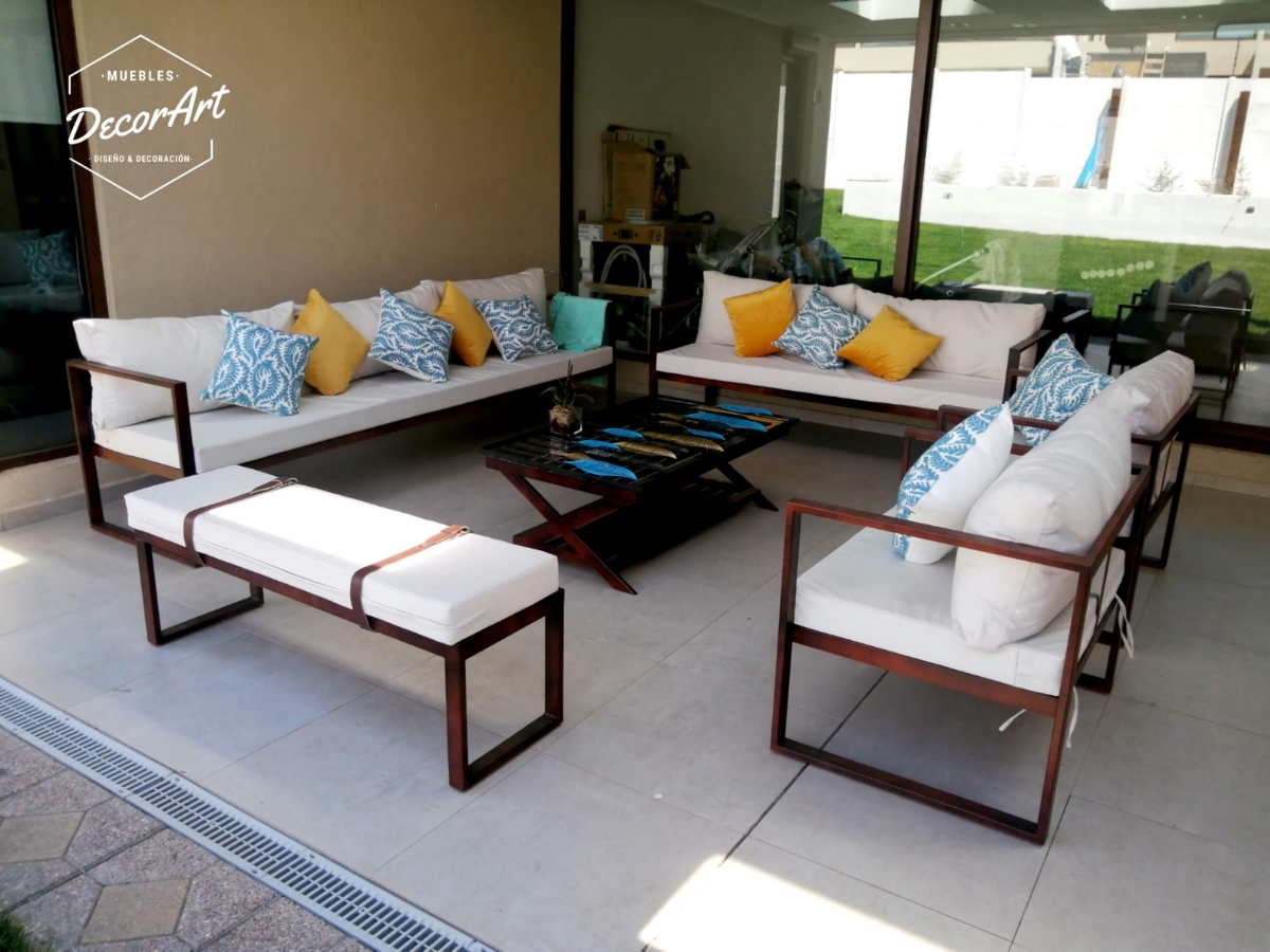 Su estructura metálica color óxido, combinada con cojines crudos de alta densidad, impermeables, con filtro UV y tratamiento antihongos, hacen de este set una opción de lujo para uso exterior durante todo el año.